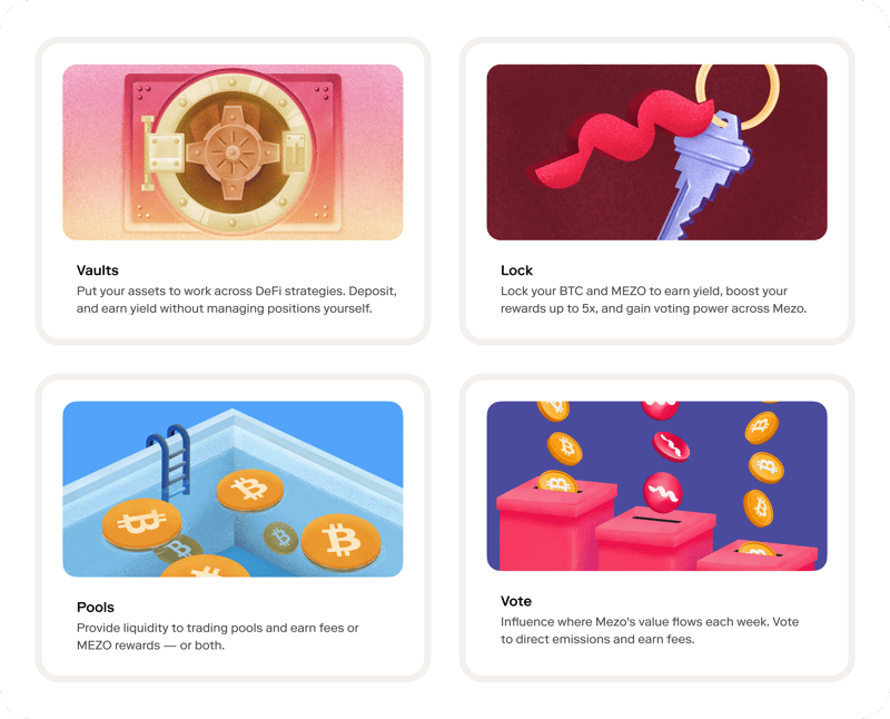 This is where your Bitcoin gets busy. Earn yield, vote on Mezo’s future, add liquidity, and much more, all from one place. It’s your home base for using Bitcoin, not just holding it.